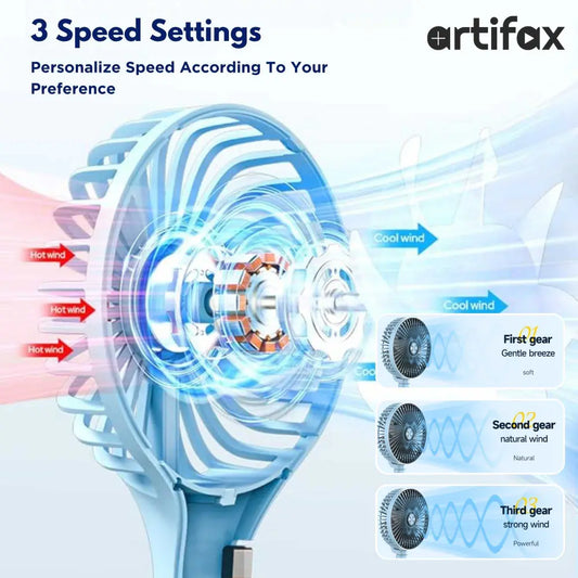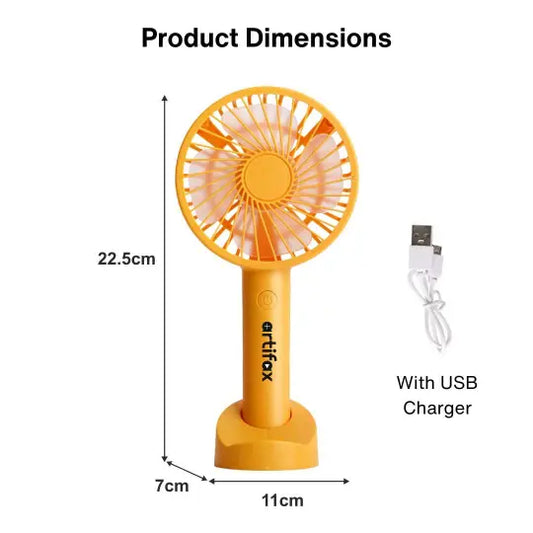 Artifax Rechargeable Handheld Fan with USB Charging | Portable Compact Design |Detachable Desktop Stand and Mobile Holder | 3-Speed Power Settings | Portable Fan for Indoor, Outdoor
